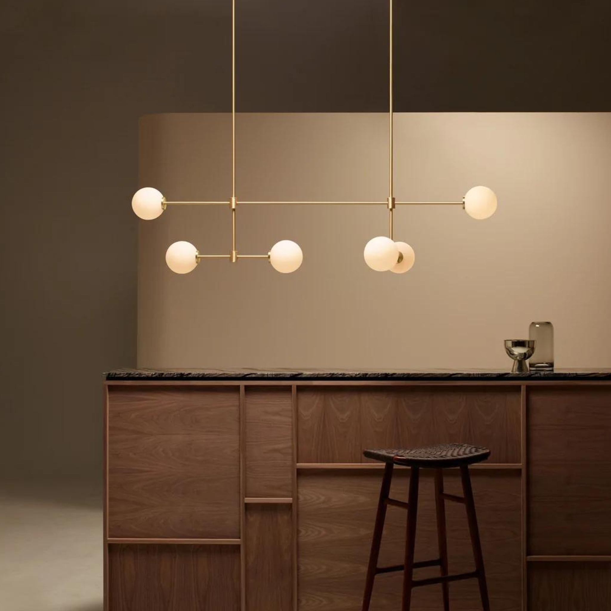 An elegant dialogue of crystal, brass, alabaster and glass