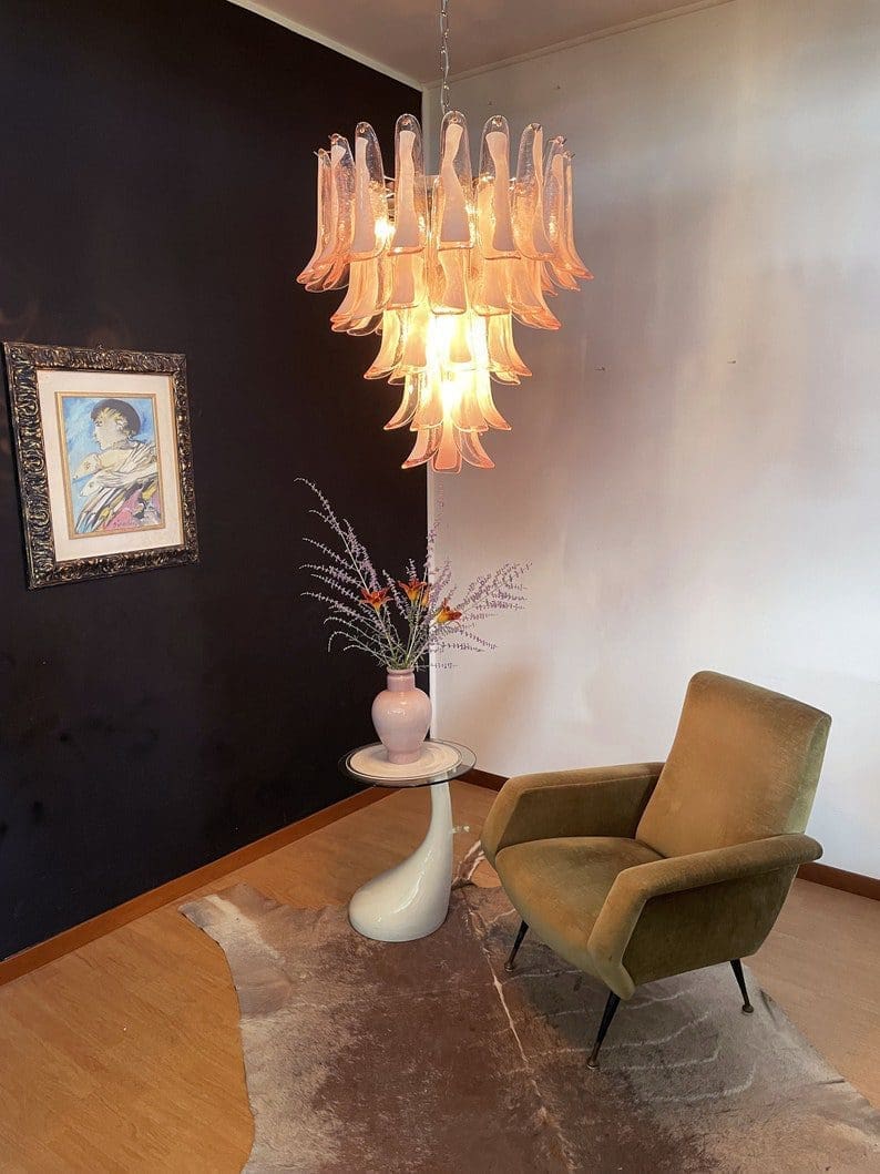 The lamp is composed of 52 large, hand-blown glass pendant petals in pink and white glass, creating an enchanting contrast and adding a touch of glamor to any room. The abstract shapes on the glasses add a subtle artistic dimension to the chandelier that catches the eye and creates a beautiful light.